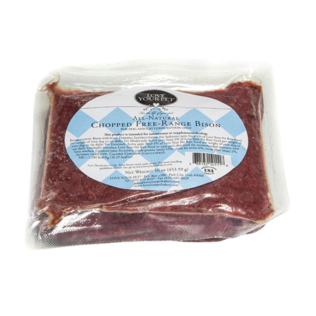 Flash frozen into 16-ounce portions, our raw, Free-Range Bison is a nutritious blend of chopped meat and ground bone. Bison is a nutrient-dense food that is an excellent source of protein, vitamins and minerals. Many people who eat bison describe it as a rich, sweet and flavorful alternate to beef. Dogs and cats love it too!