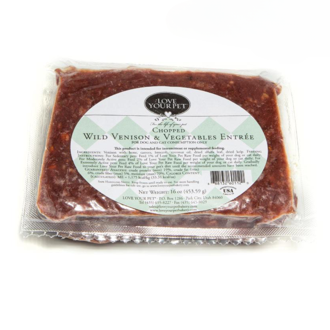 Feeding your dog or cat a wild diet of low-fat venison and 100% organic fresh vegetables will limit exposure to added growth hormones and antibiotics that are present today in most farm-raised meats. Available in 16-ounce packages.