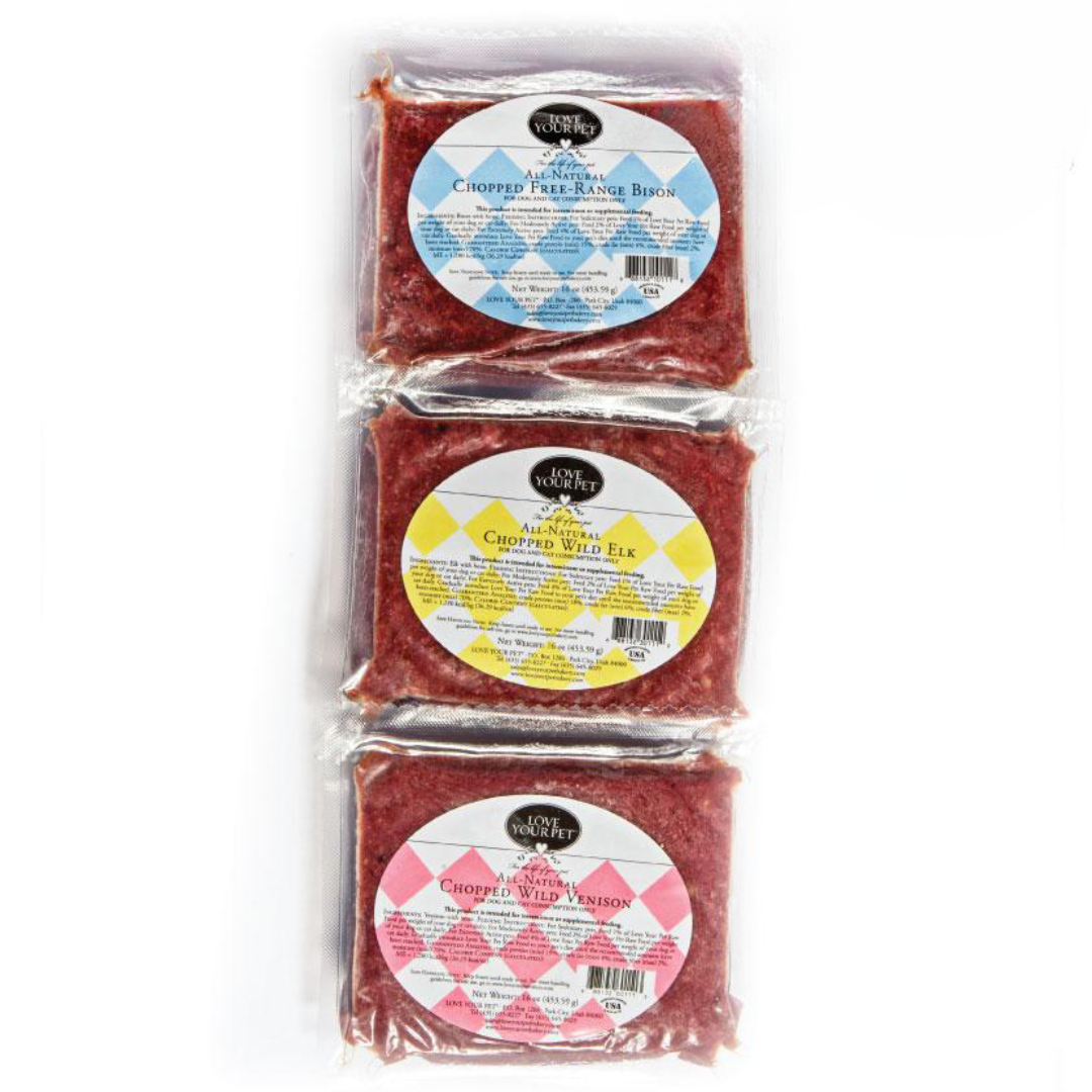 Feeding your dog or cat a wild diet of elk, bison and venison will limit exposure to added growth hormones and antibiotics that are present today in most farm-raised meats. Available in 16-ounce packages.