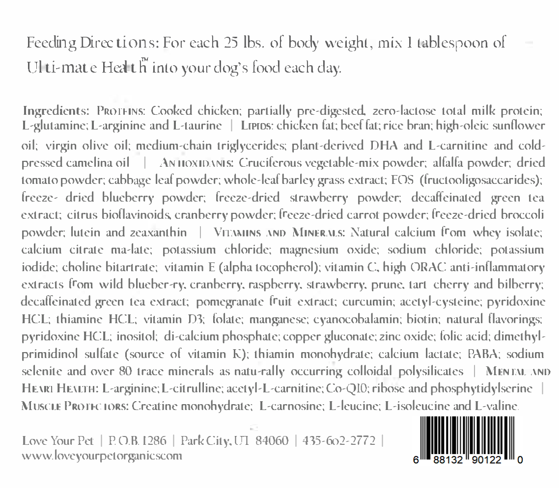Give your dog the ultimate boost with Ultimate Health™, a premium all-in-one supplement loaded with super antioxidants, probiotics, and joint support nutrients. Formulated to combat free radical damage and environmental toxins, this powerhouse blend supports everything from healthy digestion and cellular hydration to brain, heart, and eye function. Ideal for show dogs, senior pets, or dogs with allergies, this formula promotes total-body wellness with every scoop.