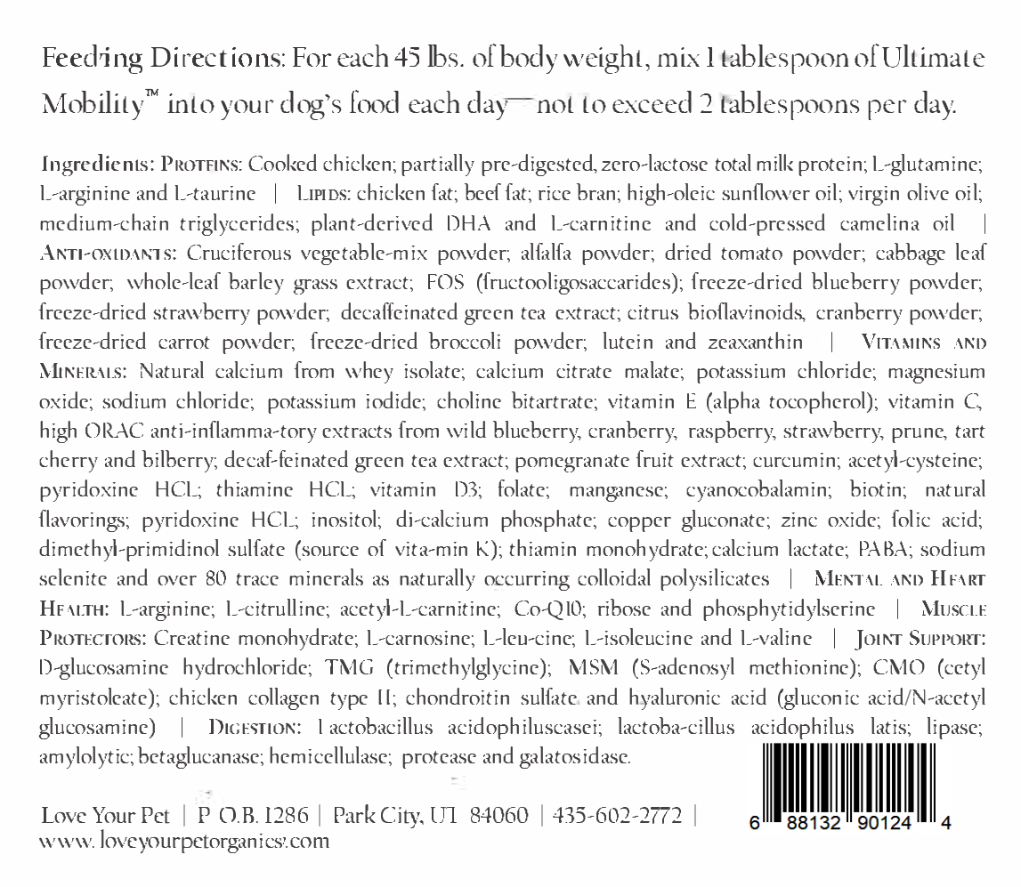 Ultimate Mobility: May help discomfort associated with normal daily exercise and activity. The cooling antioxidants fight free radical formation while at the same time support joint mobility. This super supplement actually supports natural cartilage repair and growth. You’ll never need another joint supplement again, this one truly works for older dogs. Year after year, Ultimate mobiility is our top selling supplement.